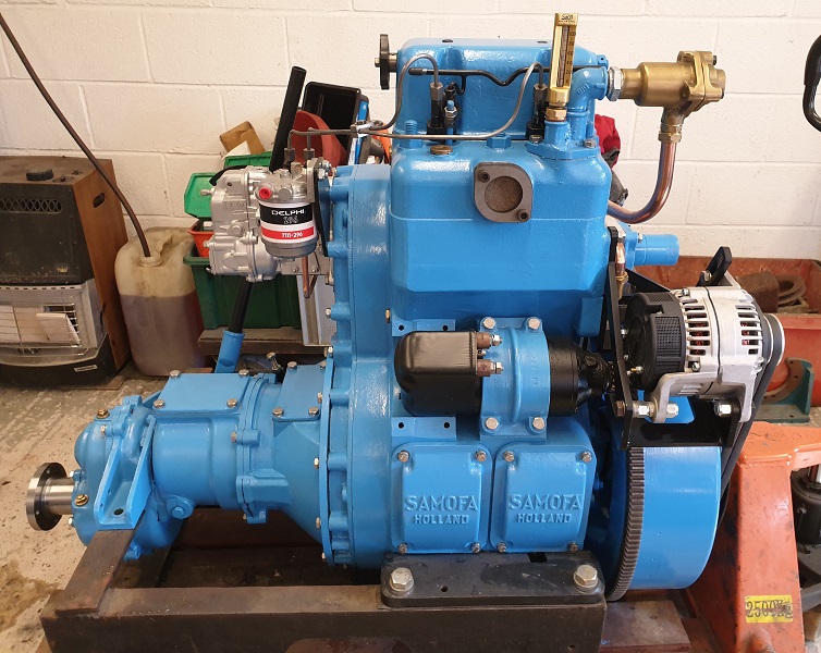 Samofa 2S108 Marine. 30hp @ 1500rpm. Although a running engine when purchased by the owner this engine had been sat for some years, because of this the engine was with us for strip, inspection and overhaul. however, a change of plans for the owner (second hand boat instead of a new one) means this beautiful engine is now available. Completed with 12v electric start, 12v 175 Amp Iskra alternator, Gear driven Jabsco coolant pump, modern fuel filter and its original 2:1 reduction gearbox this engine type makes an ideal power plant for a tradition narrowboat. Sharing many components with its cousin the Gardner 2LW it is a similar engine but without the premium the 2LW's cost.