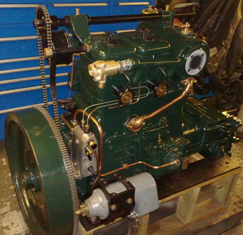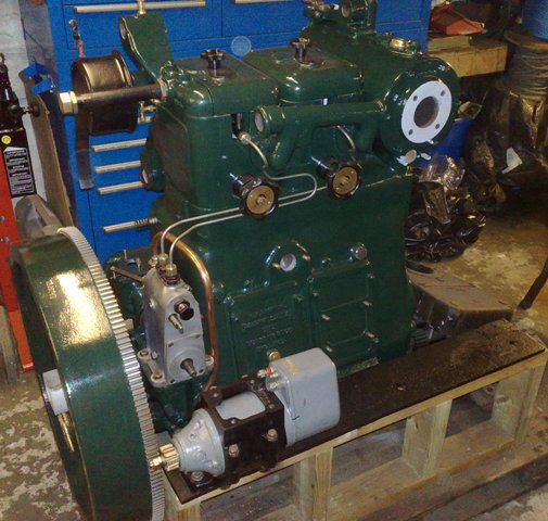 Lister JP2M. 21hp @ 1200rpm. This engine is a genuine marine unit with raised hand start and Blackstone gearbox. This engine was originally hand start only and was completed by Marine Power Services with 24v starter motor and new starter ring gear. This engine was also converted to later Lister JK type oil fed rockers.