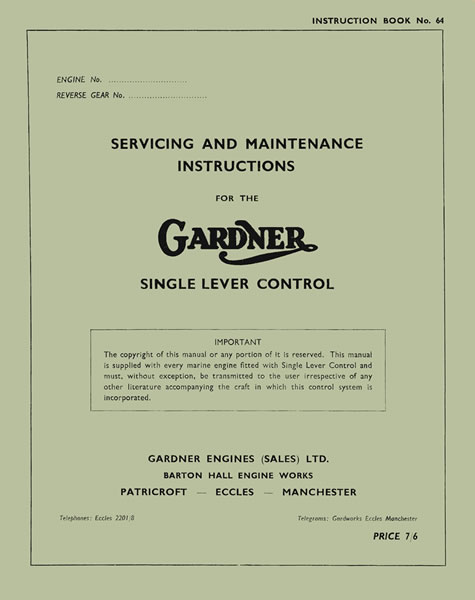 This manual covers the Gardner single lever control system used with 2 & 3 UC reversing, reduction gearboxes as fitted to Gardner LW, LX, L3 and L3B series engines. covering the Operation, Maintenance, Assembly & Installation including system schematics.