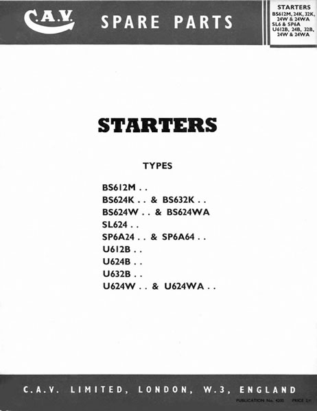 This parts manual covers CAV BS6, SL6, SP6 & U6 starter motors. in 12, 24 and 32 volt versions and has both part listings and pictoral diagrams
