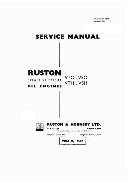 This workshop manual covers the Ruston VTO, VSO, VTH & VSH models and covers the Maintenance and Overhaul of these engines.